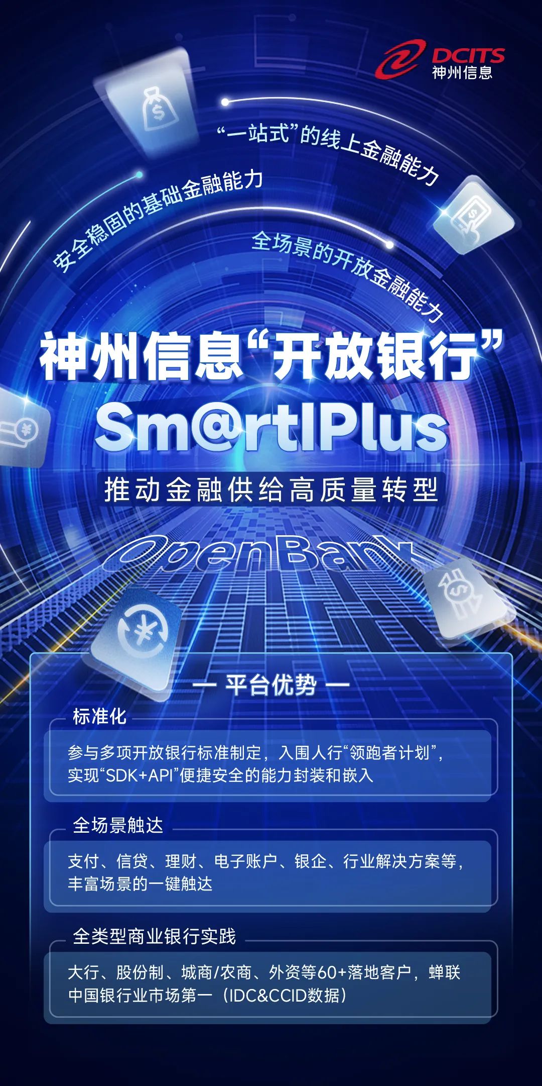 神州信息作为国内最早推动“开放银行”理念落地的公司,通过研发互联网开放平台Sm@rtIPlus等系列产品,围绕“开放、共享、共建”的Open Bank理念形成了完善的产品和服务能力。神州信息从最早参与国有大行、全国性股份制银行项目建设,再到如今结合区域银行的现实需求,从“服务能力、集成开发能力、安全能力、治理能力、运营能力”等多方面,帮助区域银行打造具有差异化特色的Open Bank能力体系,更好的结合区域特点,实现金融供给能力和产品的创新改善。